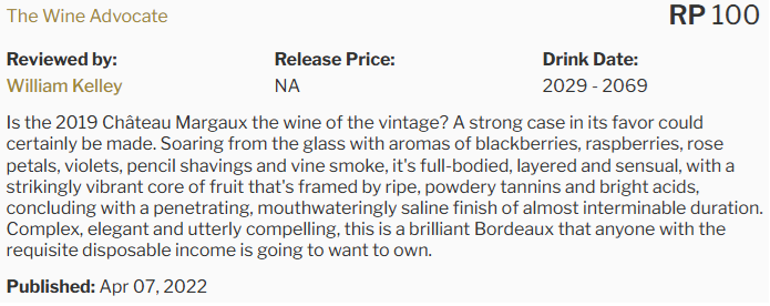 Der Jahrgang 2019 gilt als herausragend durch die Balance von Reife, Frische und Präzision. Château Margaux verbindet Konzentration mit nahezu schwereloser Eleganz und besitzt ein enormes Reifepotenzial.