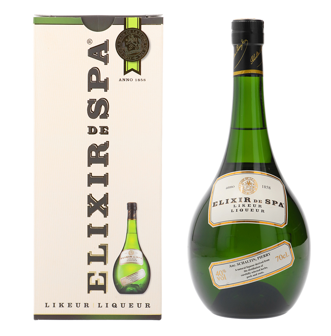 Elixir de Spa 40% 70 cl is een klassieke Belgische kruidenlikeur met een rijke geschiedenis die teruggaat tot de 17de eeuw, ontwikkeld door Kapucijnen in de regio Spa en later geproduceerd door F.X. de Beukelaer. Deze likeur wordt gemaakt uit een zorgvuldig geselecteerde mix van tientallen aromatische planten, kruiden en schorsen, met een zacht maar karaktervol aroma en een evenwichtige, kruidige smaak met subtiele zoete en bittere tonen.